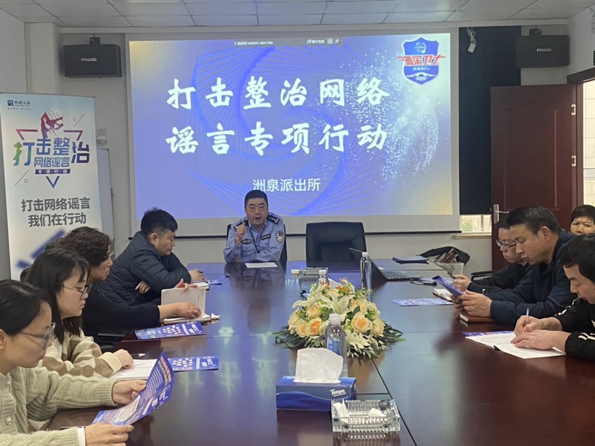 活動現場,洲泉派出所民警結合相關案例,通過“以案說法”方式,向員工科普網絡謠言的概念、種類、危害以及甄別方法,幫助員工樹立正確的網絡安全意識,并告誡員工造謠需承擔相應的法律責任,要堅決做到文明上網、安全上網、守法上網,自覺成為守護網絡安全的衛士。