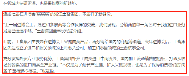 11月5日至10日,第七屆中國國際進口博覽會(進博會)在上海國家會展中心舉辦。本屆進博會以“新時代,共享未來”為主題,吸引了來自152個國家、地區和國際組織的參展商。浙江土畜組織旗下6家企業的30余名代表積極參會。浙江日報、潮新聞、浙江衛視、浙江國資等多家媒體對浙江土畜參會進行了報道。
