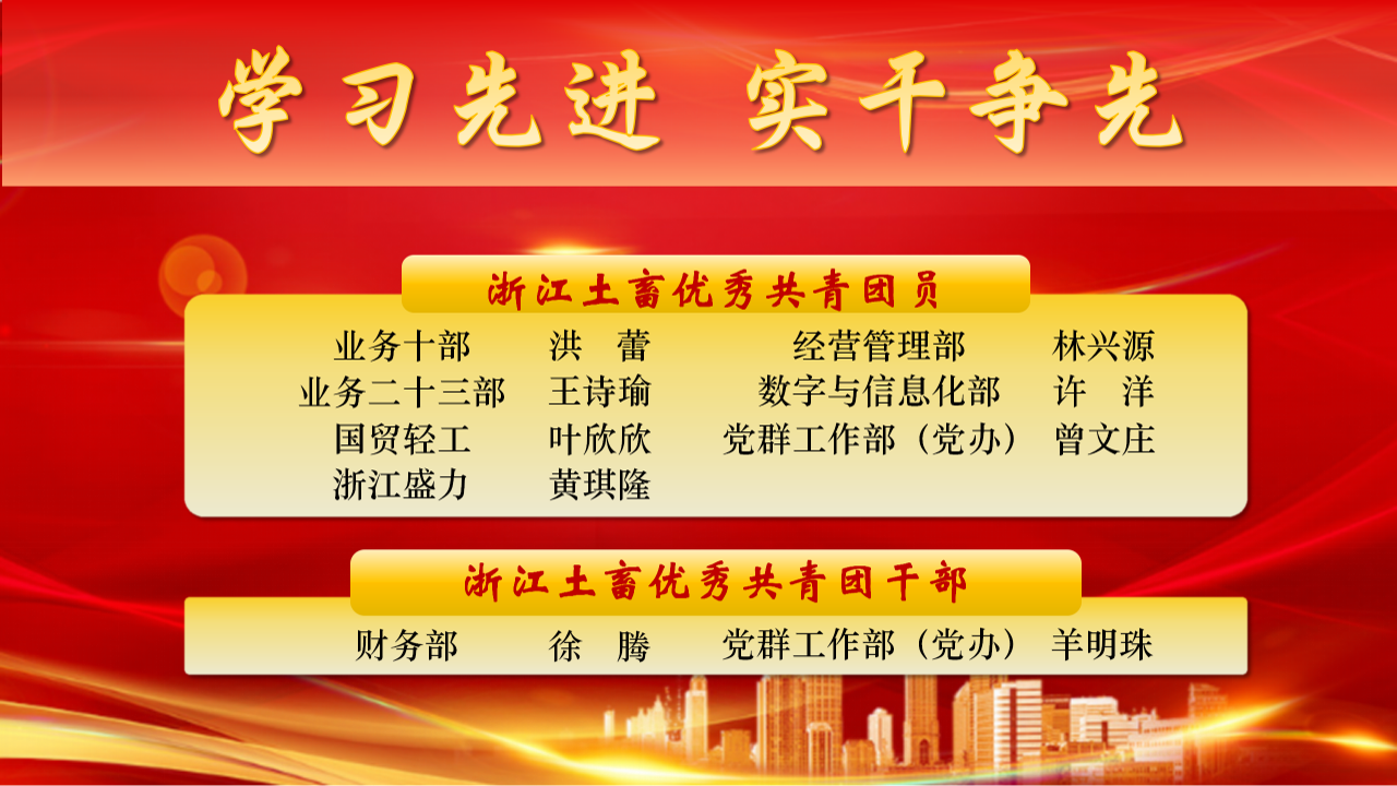 為表彰先進(jìn)、樹立榜樣,激勵(lì)公司各級(jí)團(tuán)組織和廣大團(tuán)員青年比學(xué)趕超、奮勇爭(zhēng)先,浙江土畜團(tuán)委決定,對(duì)2024年度優(yōu)秀共青團(tuán)員、優(yōu)秀共青團(tuán)干部予以表彰。希望各級(jí)團(tuán)組織和團(tuán)員青年,要以受表彰的先進(jìn)典型為榜樣,學(xué)習(xí)他們對(duì)黨忠誠、積極向上的政治本色,學(xué)習(xí)他們敢挑重?fù)?dān)、沖鋒在前的硬核擔(dān)當(dāng),學(xué)習(xí)他們立足一線、創(chuàng)先爭(zhēng)優(yōu)的務(wù)實(shí)作風(fēng),學(xué)習(xí)他們遵規(guī)守紀(jì)、積極作為的職業(yè)操守。要大力傳承和發(fā)揚(yáng)土畜人“實(shí)干”的優(yōu)良傳統(tǒng),在深度融入共同富裕、開放強(qiáng)省等重大戰(zhàn)略中加快打造“國際供應(yīng)鏈服務(wù)價(jià)值創(chuàng)造者”,貢獻(xiàn)更多青春力量。
