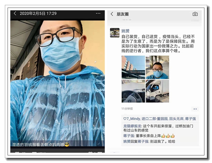 為了確保與公司長(zhǎng)期合作的大型超市冷凍肉類貨源供應(yīng)充足,維護(hù)市場(chǎng)肉類產(chǎn)品的價(jià)格穩(wěn)定,省土畜進(jìn)口二部副經(jīng)理姚赟面對(duì)冷庫(kù)基地限時(shí)開(kāi)放、外包運(yùn)輸受限無(wú)法上路的不利局面,與同事承擔(dān)起了緊急配送的民生保障任務(wù)。整整兩車共計(jì)10噸凍肉的裝卸配送后,汗水、熱氣讓姚赟的外套和防護(hù)雨披黏在了一起,輕貓淡寫(xiě)的一句“濕透的羽絨服看去有點(diǎn)肌肉感!”背后隱含的是土畜人為合作客戶和消費(fèi)者極限服務(wù)的責(zé)任心。