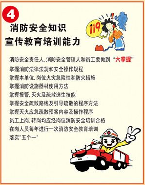 22.消防安全“四個(gè)能力”:檢查消除火災(zāi)隱患能力、撲救初起火災(zāi)能力、組織人員疏散逃生能力、消防宣傳教育培訓(xùn)能力。